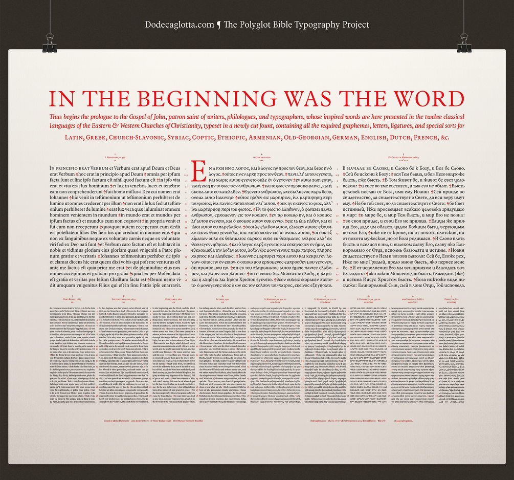 Dodecaglotta is my polyglot Bible typography project, working towards a bibliophile edition of holy Scripture, in twelve classical languages (Greek, Latin, Syriac, Coptic, Ethiopic, Armenian, Georgian, Church-Slavonic, German, English, Dutch, French), designed to the highest standards in multilingual parallel typesetting. ¶ This beautifully printed broadsheet of the Prologue to the Gospel of John is Dodecaglotta’s first edition. It serves both as a type specimen of the fonts that are in the make, and as a proof-of-concept for the twenty-first century codex I envision.